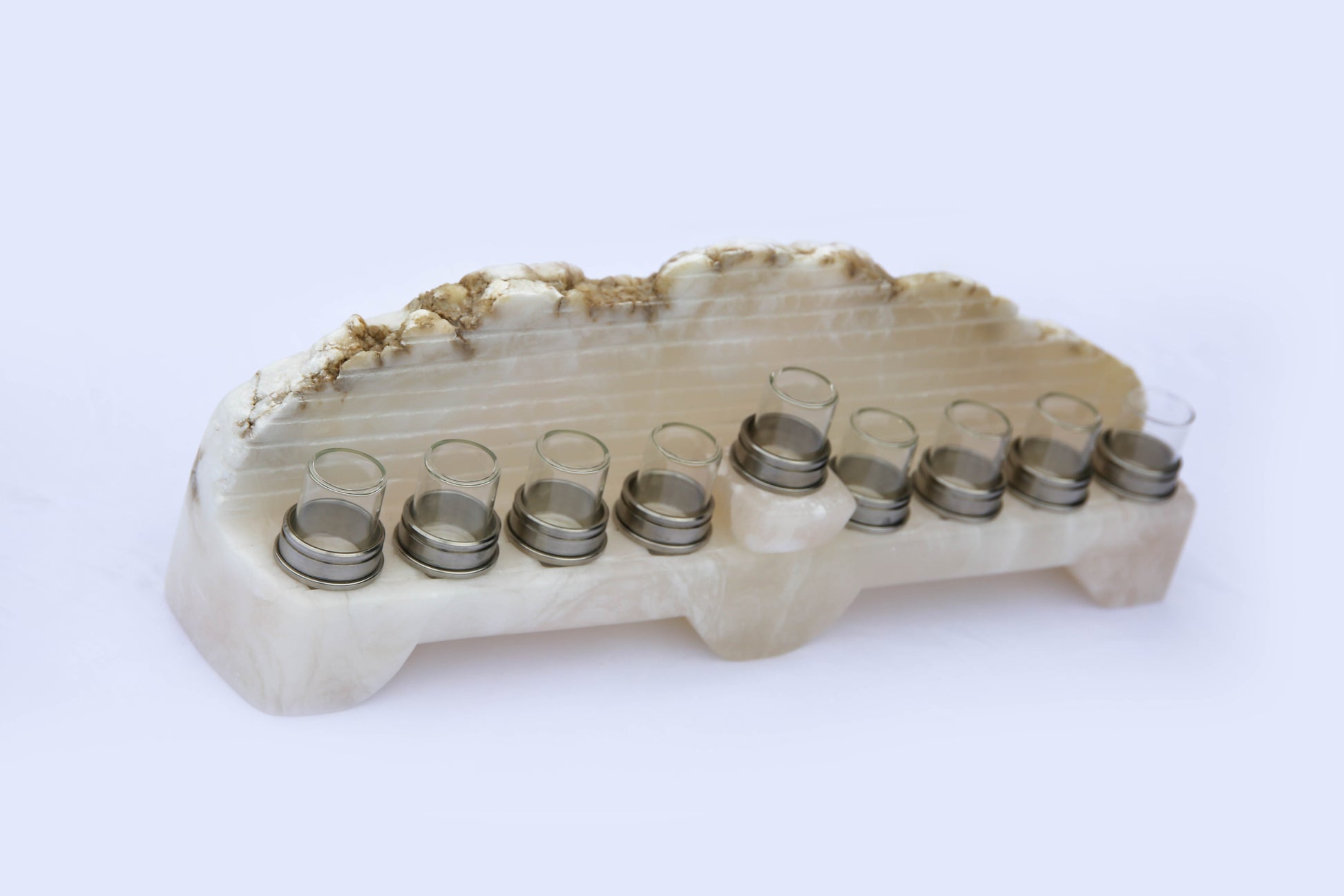 חנוכייה ייחודית בעבודת יד, עשויה מאבן אלבסטר טבעית. יצירה חד-פעמית שמשלבת אומנות, יוקרה וקדושה, המוסיפה אור ואלגנטיות לחג החנוכה. ארץ מוצא דרום אמריקה.